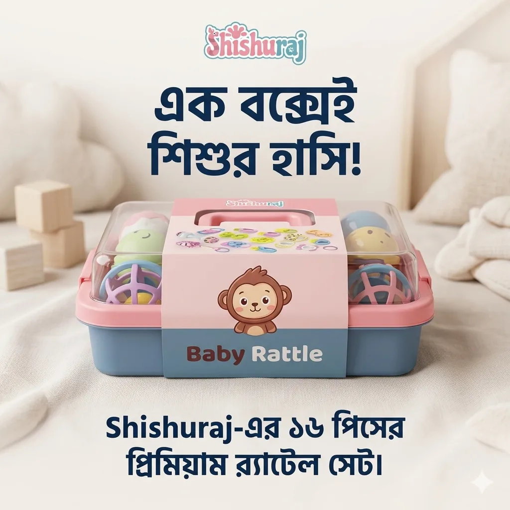 এক সেটে ১৬টি ভিন্ন rattle — variety play ও learning নিশ্চিত করে।