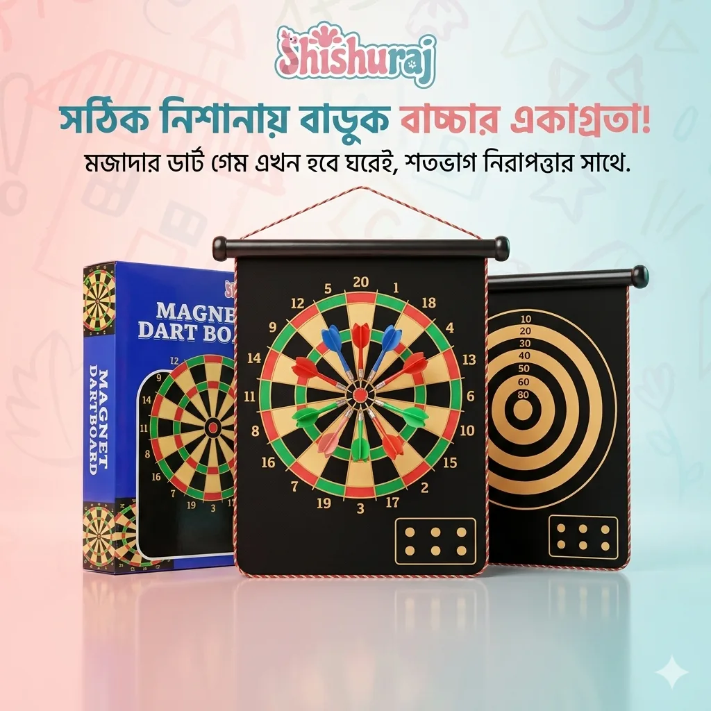 এই Double-Sided Magnetic Dart Board Game বাচ্চাদের জন্য একটি safe ও fun indoor game। sharp dart ছাড়া magnetic dart ব্যবহার হওয়ায় এটি নিরাপদ, আর দুই পাশের board design খেলাকে আরও exciting করে তোলে।